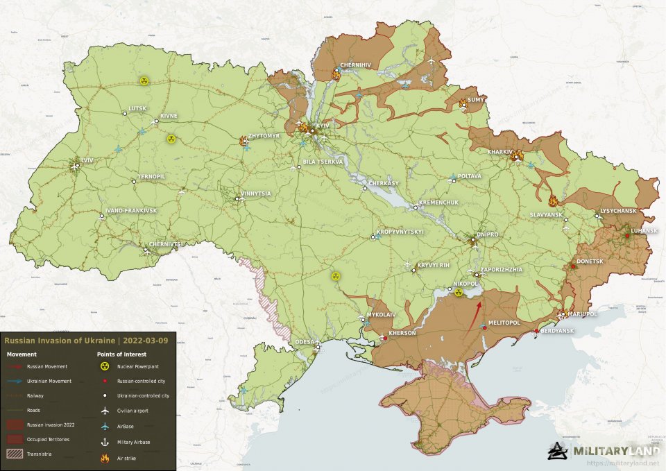 През последните дни /примерно от 10-14-тия ден на войната/ настъплението на съветските войски в Украйна очевидно се забави. Колоните съветски бойни групи към този момент не изминават десетки километри дневно и не престават да понасят огромни загуби вследствие на украинските контраатаки, засадите и удари върху колони с техника и гориво. Всички тези триумфи са добре документирани от публицистите и жителите с мобилни телефони. Това обаче