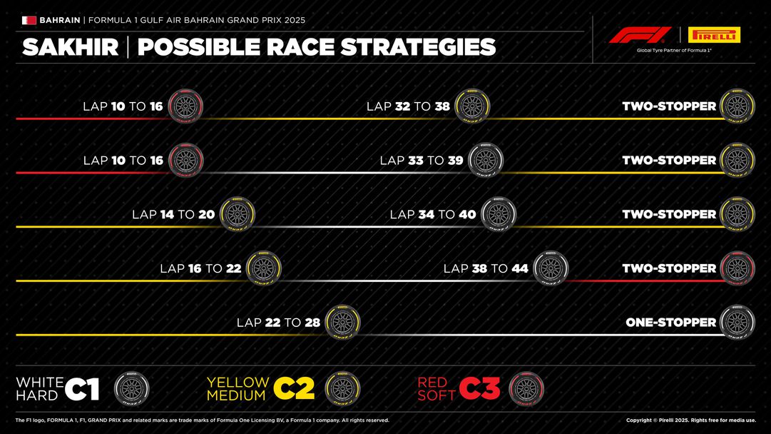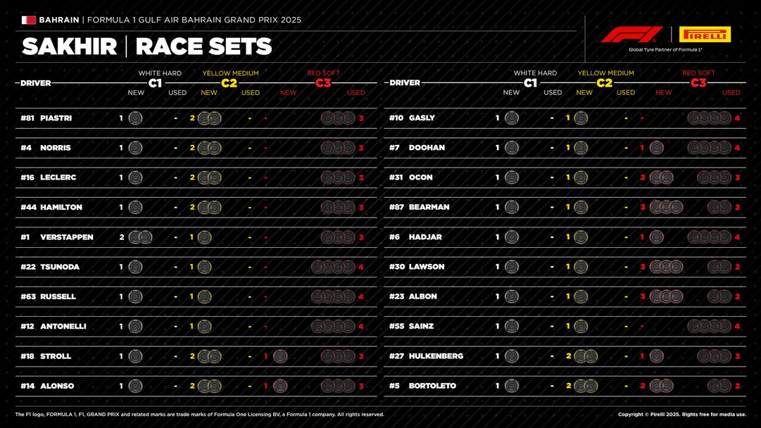 Очакванията на Пирели са това да се повтори и през днешния ден, като от италианската компания оферират няколко разнообразни разновидността за покриване на дистанцията от 57 обиколки на „ Сахир “. Според данните на Пирели най-оптималният вид е старт с меките гуми, след което да се премине към приблизително твърдите, с които да се създадат две серии от обиколки.