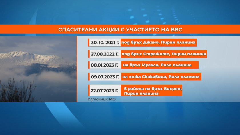 През последните 3 години такива акции има в Рила и в Пирин. При 4 от 5 задачи разноските са били за сметка на институцията, декларирала нуждата от използването на военните вертолети, надлежно Министерството на здравеопазването или Министерство на вътрешните работи.