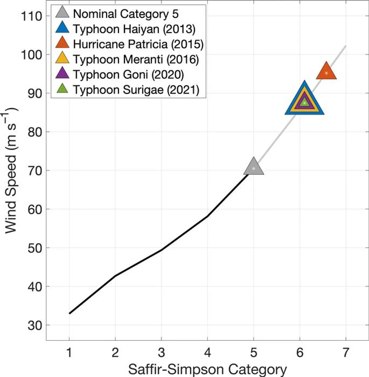 В ново изследване откривателите означават по какъв начин през последните години са следени няколко стихии, които надалеч надвишават този предел на скоростта. В тази връзка те оферират управляващите да помислят за въвеждането на нова категория – 6 – за установяване на ураганите и тайфуните, при които скоростта напразно надвишава 309 километра в час.
