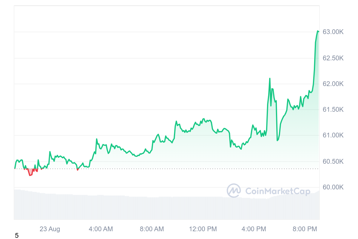 След мненията на Пауъл цената на BTC бързо се повиши над границата от $63,000 – равнище, което не бе достигал oт съвсем месец – защото вложителите реагираха позитивно. Към момента на писане на публикацията водещата криптовалута се търгува на цена от $63,003, преживявайки растеж от 5% за последните 24 часа.
