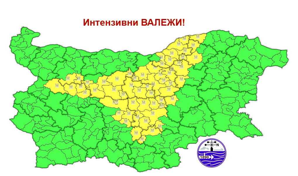 През идващото денонощие през страната ще минава леден атмосферен фронт. От запад на изток ще се развива купеста и купесто-дъждовна облачност. Ще има краткотрайни превалявания, съпроводени с гръмотевици, на повече места в Западна и Централна България, където ще има условия за обилни превалявания, гръмотевични стихии и градушки. За тези области от Национален институт по метеорология и хидрология издадоха жълт сигнален код за интензивни превалявания.