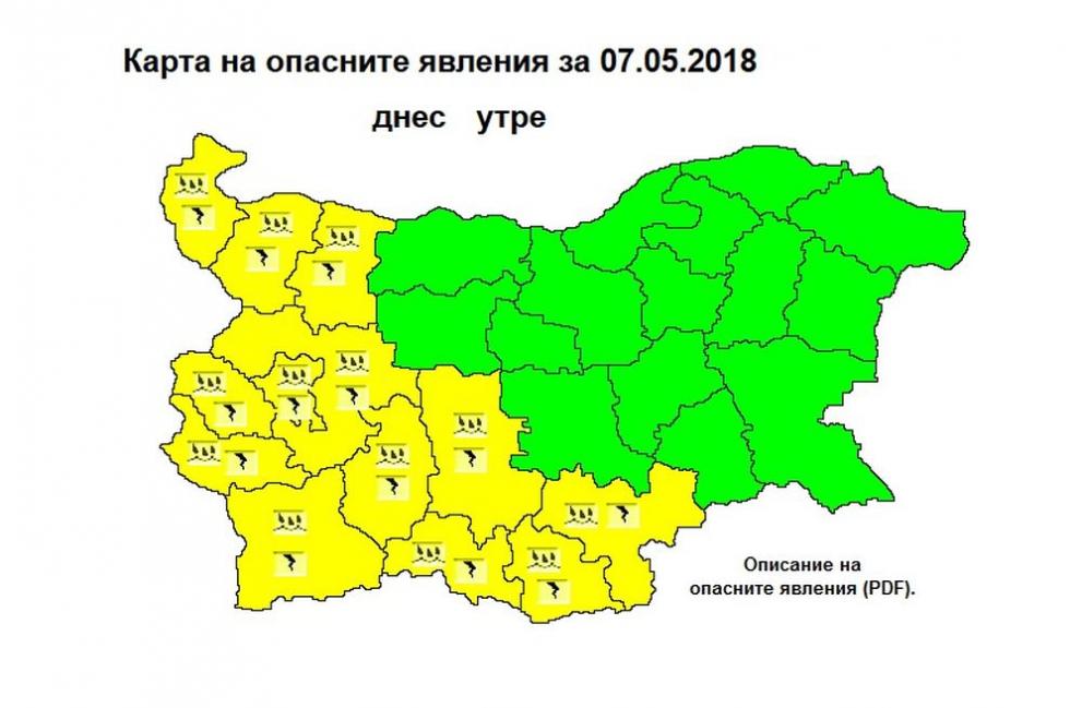 Национален институт по метеорология и хидрология п Жълт код е разгласен за регионите в Западна и Южна България . Предупреждението е в действие за 13 области - това са Видин, Враца, Монтана, София област, София-град, Перник, Кюстендил, Благоевград, Пазарджик, Пловдив, Смолян, Кърджали и Хасково.