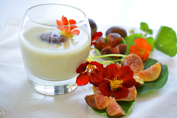 Екстравагантен опит е предлагането ми за бадемово гаспачо с латинки и смокини. Избрах латинката, тъй като е освен от красивите ядливи цветя, които багрят градините до късна есен. Нейните цветове и листа се употребяват в кулинарията за салати, супи и маринати поради усет и мирис, наподобяващи тези на кресона.За гаспачото използвах една остаряла франзела, авансово нарязана, 1 1/2 чаши бланширани бадеми, 10 листа от латинка (може да замените със скилидки чесън), 2-3 с. л. оцет, 1 ч. л. сол, 100-150 мл зехтин, 4 чаши ледена вода, смокини. Как го направих: Накиснах частите франзела във вода и ги изстисках. Поставих в блендер дружно с листата от латинка и бадемите и блендирах до безпрепятствено пюре. Добавих оцет, сол, зехтин (на тънка бликам, до момента в който се усвои) и вода. Прецедих през решето и оставих да се охлади. Гарнирах всяка чаша с една смокиня и цвят от латинка.