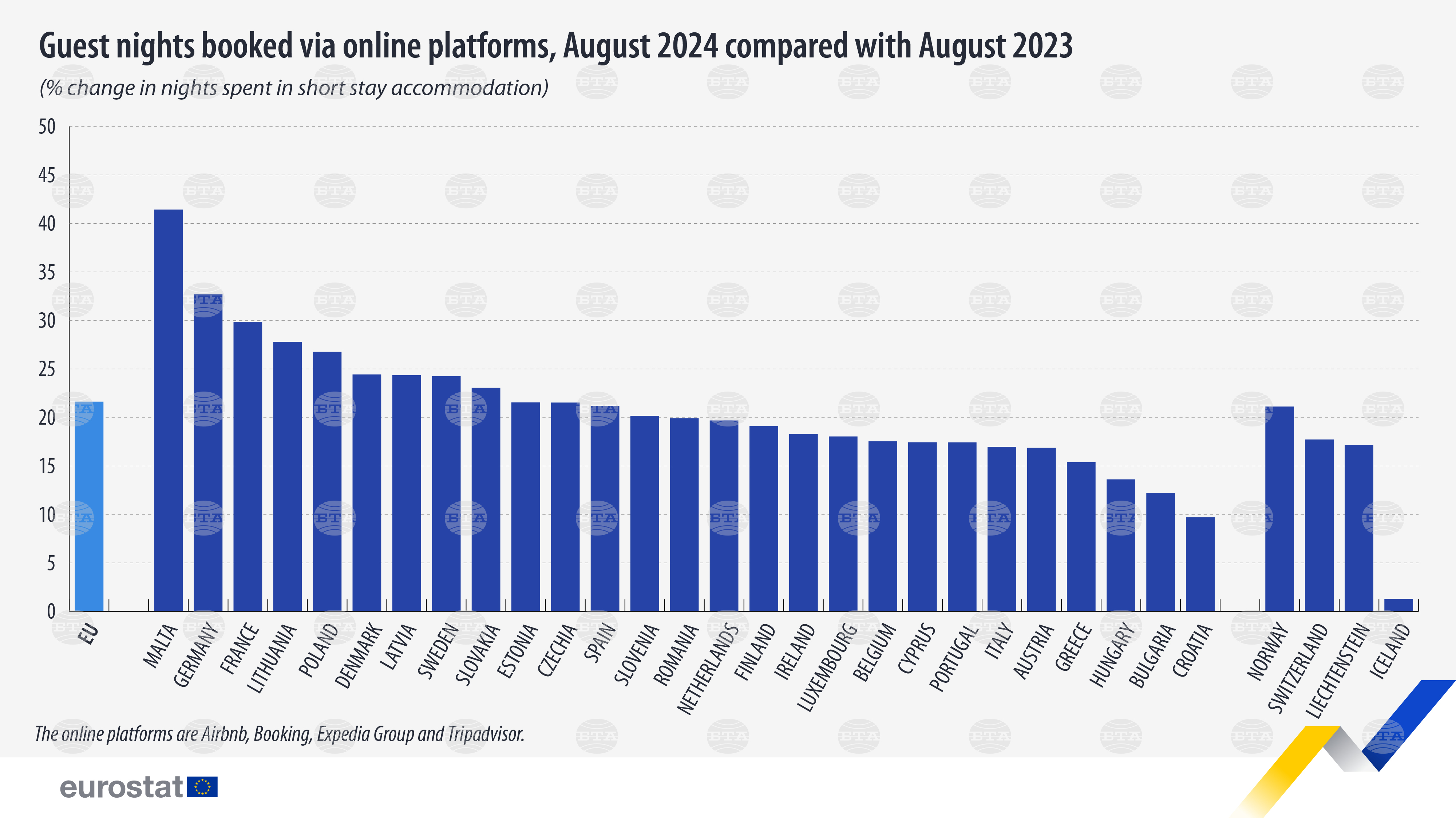 Всички страни в Европейски Съюз регистрират напредък на броя на нощувките, резервирани през онлайн платформи през август 2024 година, най-натоварения месец в туристическия бранш в Европейски Съюз. Най-голям напредък отчитат Малта (+41,4 на 100 по отношение на август 2023 г.), Германия (+32,7 на сто) и Франция (+29,9 на сто).