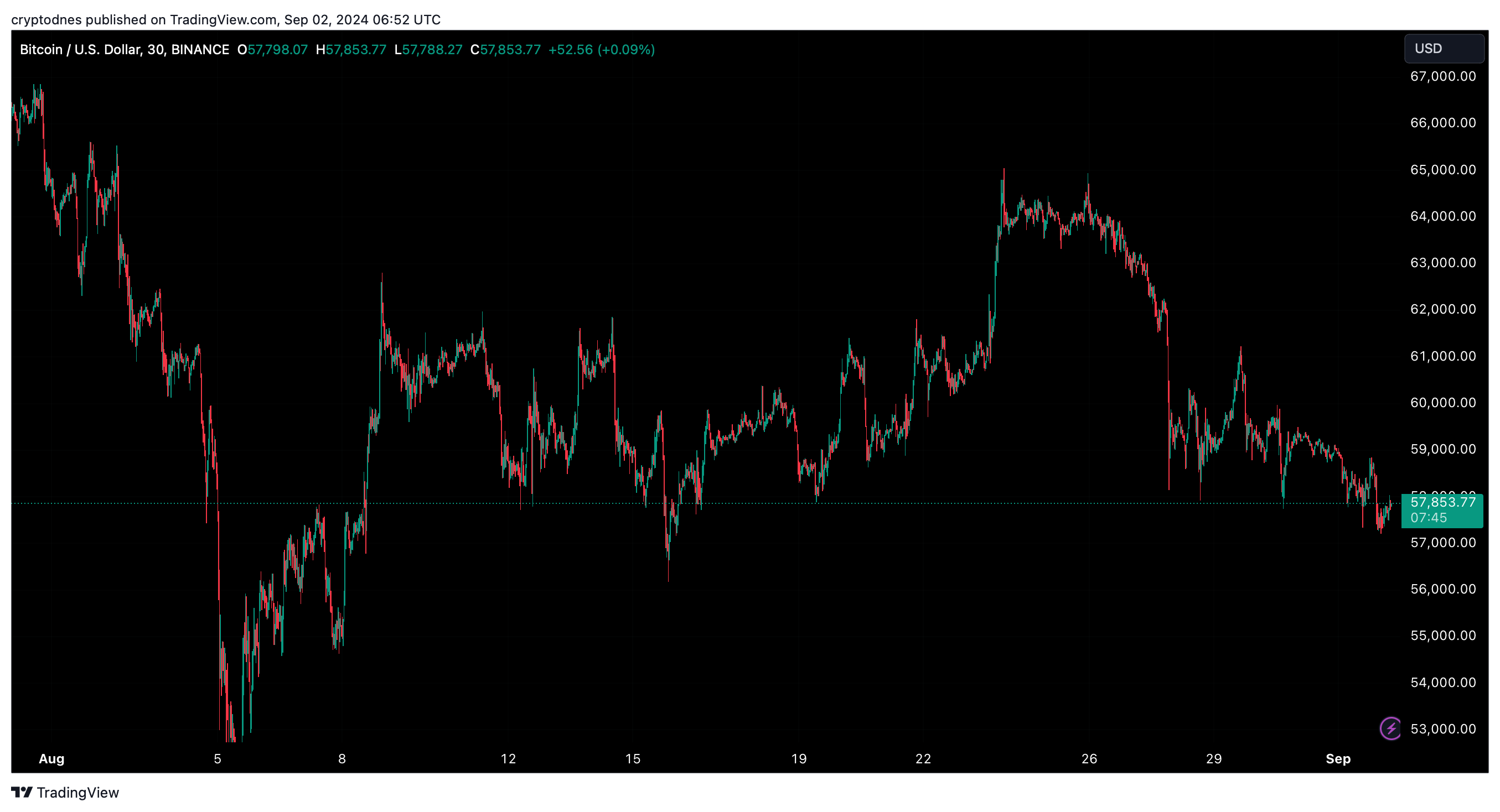 Към 10;00 ч. българско време Биткойн се търгува на цена от 57,850, отбелязвайки спад от 1% през последните 24 часа и съвсем 10% за седмицата.