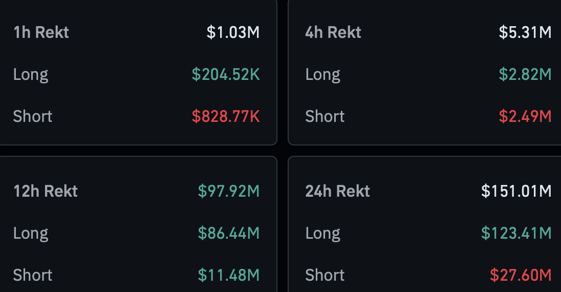 На пазара се следиха обилни ликвидационни интервенции, като през последните 24 часа бяха премахнати над $151 милиона, главно от лонг позиции, в това число $45.62 милиона разпродажба на Биткойн.