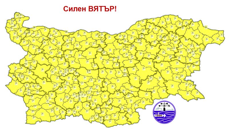 От Национален институт по метеорология и хидрология също предизвестяват с жълт код за рисково мощен вятър в цялата страна.