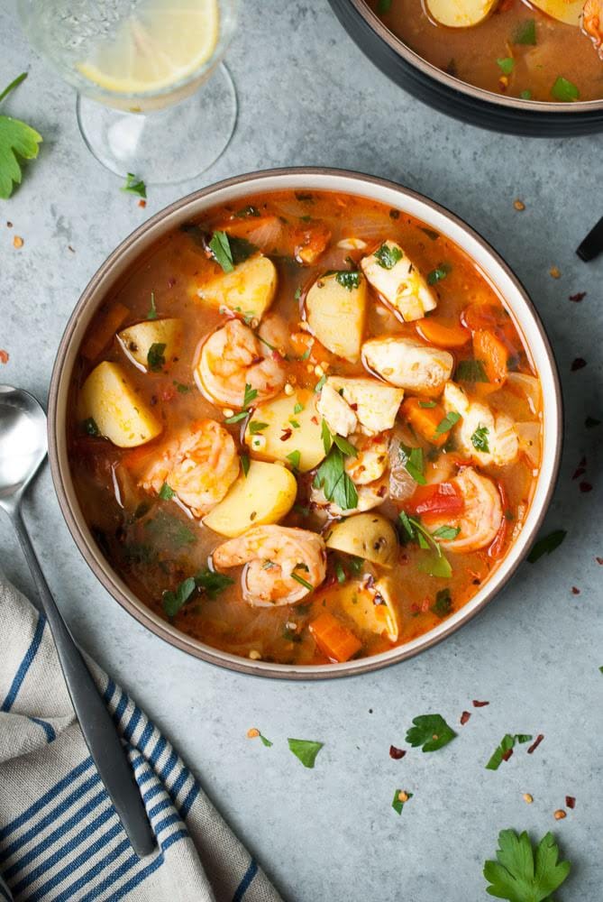 Начин на подготвяне: Чушката и лукът се нарязват на ситно и се задушават в мазнината. Към тях се прибавят и нарязаните на кубчета картофи, с цел да се запържат за няколко минути. Добавете сол и черен пипер на усет.Прибавете вода, която да покрие картофите и сложете нарязаните калмари. Когато супата заври може да добавите и рибата, почистените скариди и мидите. Варете, до момента в който мидите си отворят черупките.Преди да сервирате завършете супата с нарязания на ситно магданоз и счукания чесън. По предпочитание може да се добави малко шафран.