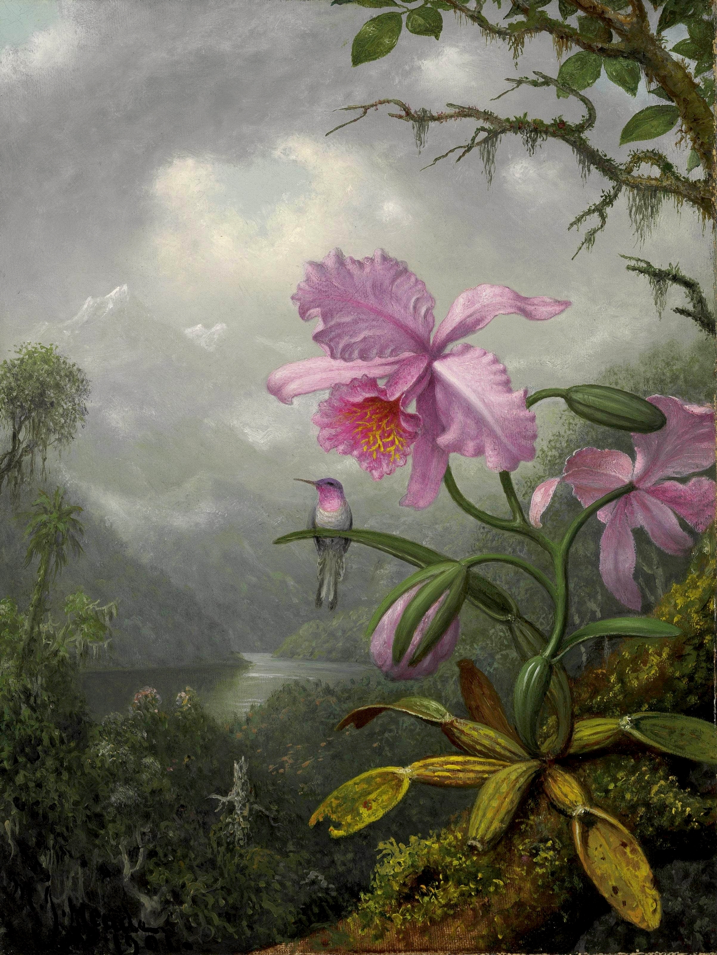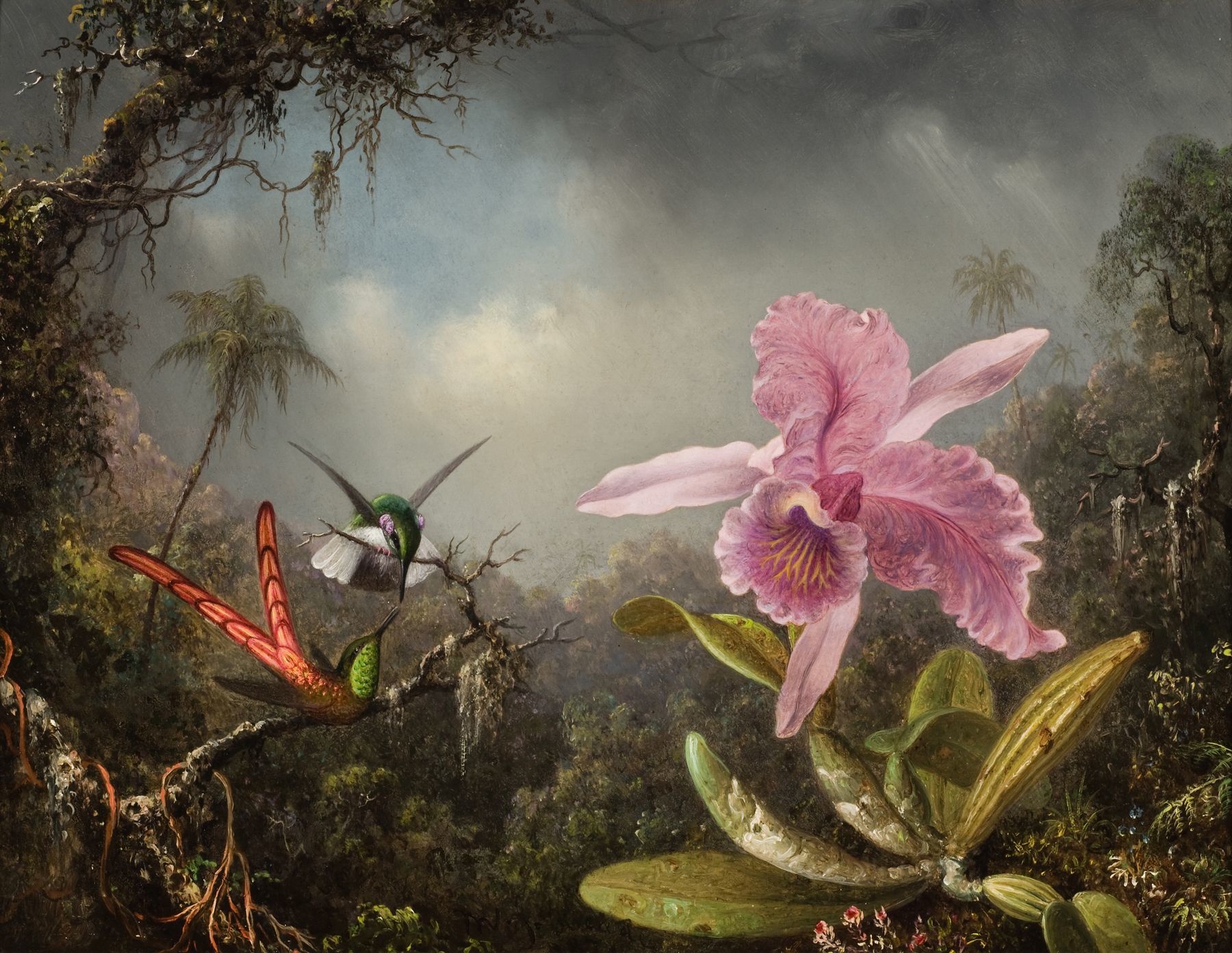 (Orchid with Two Hummingbirds, 1871, by Martin Johnson Heade)