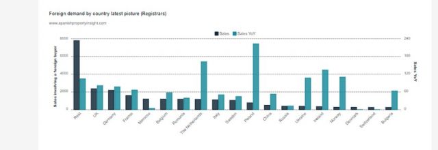 За съпоставяне, броят на транзакциите с испански купувачи е повишен единствено с 13% (до 139 880). Общият брой покупко-продажби на пазара се усили с 19,5% и възлиза на 163 909 покупко-продажби.