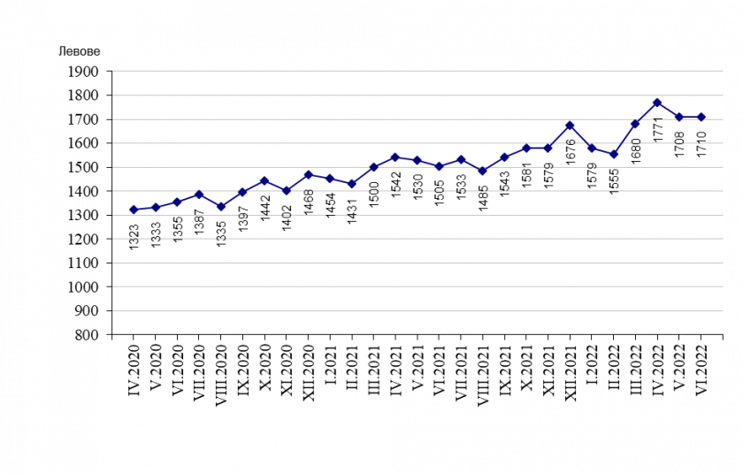 Средната брутна месечна работна заплата за април 2022 година е 1 771 лева, за май - 1 708 лева, и за юни - 1 710 лв..