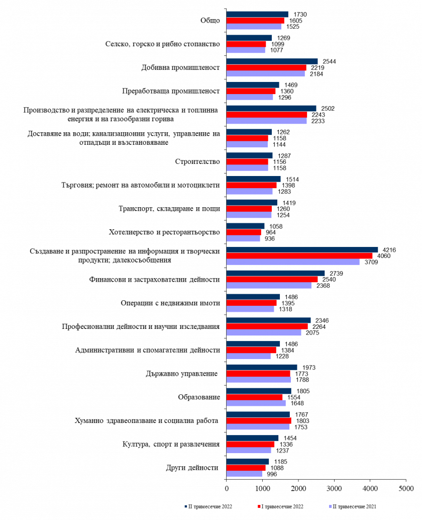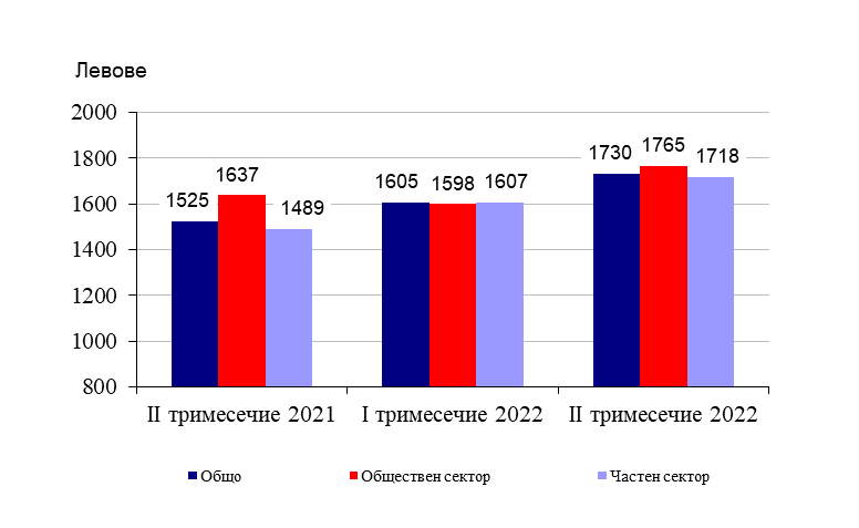 През второто тримесечие на 2022 година междинната месечна работна заплата e 1730 лева и нараства по отношение на първото тримесечие на 2021 година със 7,8%, оповестиха от Националния статистически институт. Икономическите действия, в които е записано най-голямо нарастване, са „ Образование “ - с 16,2%, „ Селско, горско и рибно стопанство “ - с 15,5%, и „ Добивна индустрия “ - с 14,6%. Намаление на заплатите с 2% е записано в активност „ Хуманно опазване на здравето и обществена работа “.