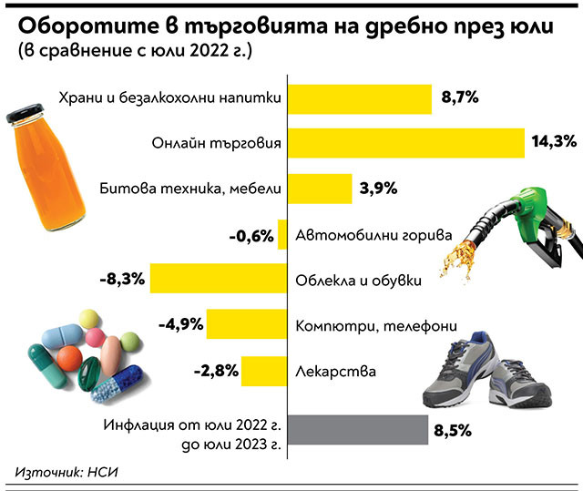 Ограниченията в потреблението, които са си наложили българите, не престават с цялостна мощ за всички останали артикули като се изключи онлайн продажбите (виж инфографиката). Оборотите от продажба на дрехи и обувки са с 8,3% по-ниски по отношение на година обратно, на компютри и телефони - с 4,9%, а на медикаменти - с 2,8%.