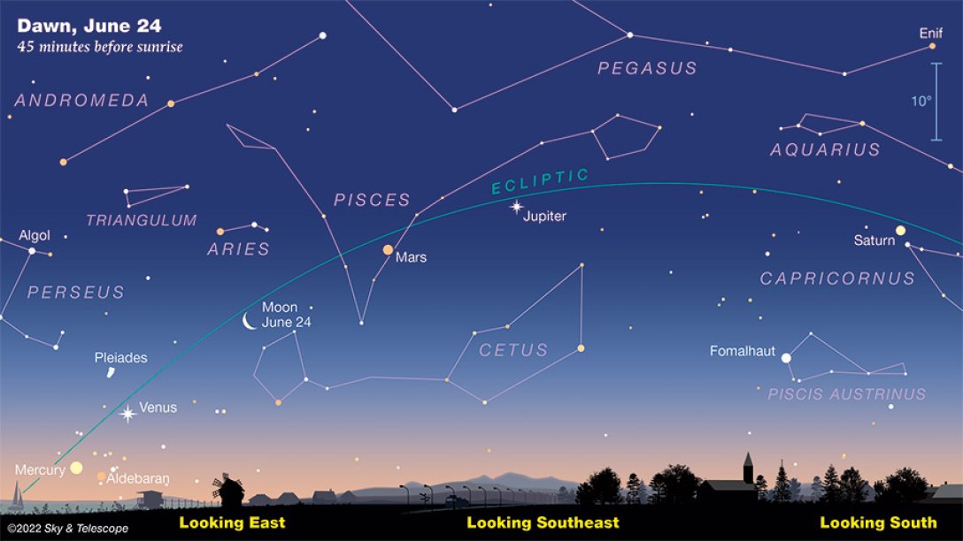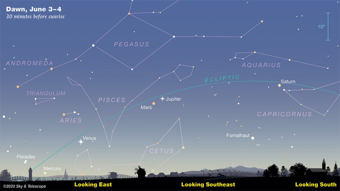 Рано сутринта преди изгрев слънце на 3 и 4 юни и изключително на 24 юни петте планети Меркурий, Венера, Марс, Юпитер и Сатурн ще се подредят в нощното небе