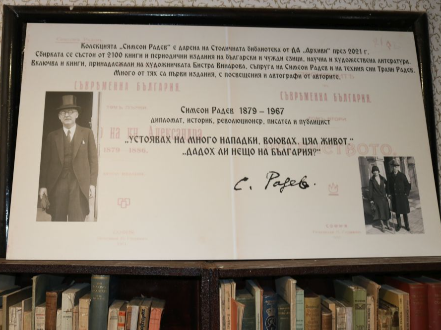 От своя страна ДАА прави подаяние на Столична библиотека, към чийто фондове се прибавят тези над 2250 тома книги и периодика, обособени в няколко тематични раздели. Редките и значими заглавия от сбирката на Симеон Радев се цифровизират и качват на налични цифрови платформи, което разрешава да са разполагаем на по-широк кръг читатели. Към сбирката от книги и периодически издания ДАА подарява на Столична библиотека и персонални движимости на Симеон Радев – визитник, очила, кутия за моливи, скъпи мебели и артефакти от интериора на фамилния жилището на Бистра и Симеон Радеви.