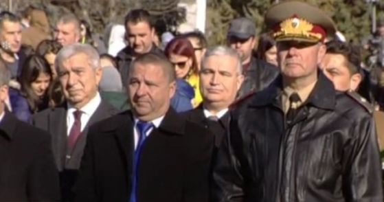 Заедно с него на площад „ Княз Александър Невски “ бяха министър Красимир Каракачанов и кметът на столицата Йорданка Фандъкова. Радев одобри почетния строй на армията и тържествено постави венец на паметника на Незнайния войник.