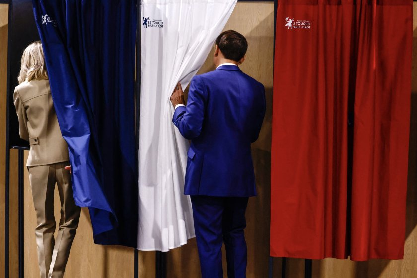 Президентът на Франция Еманюел Макрон гласоподава на първия тур на предварителните парламентарни избори във Франция, които той свика преди три седмици, след изборното проваляне на евровота на неговата центристка коалиция.