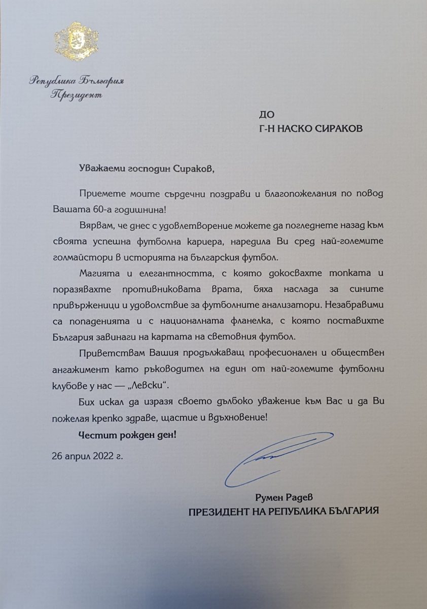 Президентът на Република България господин Румен Радев изрази своето почитание към мажоритарния притежател на „ ПФК Левски “ господин Наско Сираков с приветствен адрес към голмайстор №1 на „ сините “ по случай 60-годишния му празник.