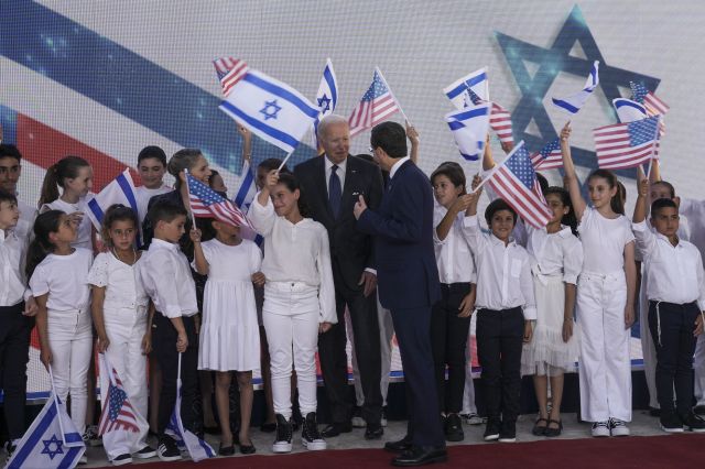 Байдън беше приветстван от Херцог и брачната половинка му Михал, които го придружиха, до момента в който мина около усмихнати деца, въодушевено развяващи американски и израелски флагове.