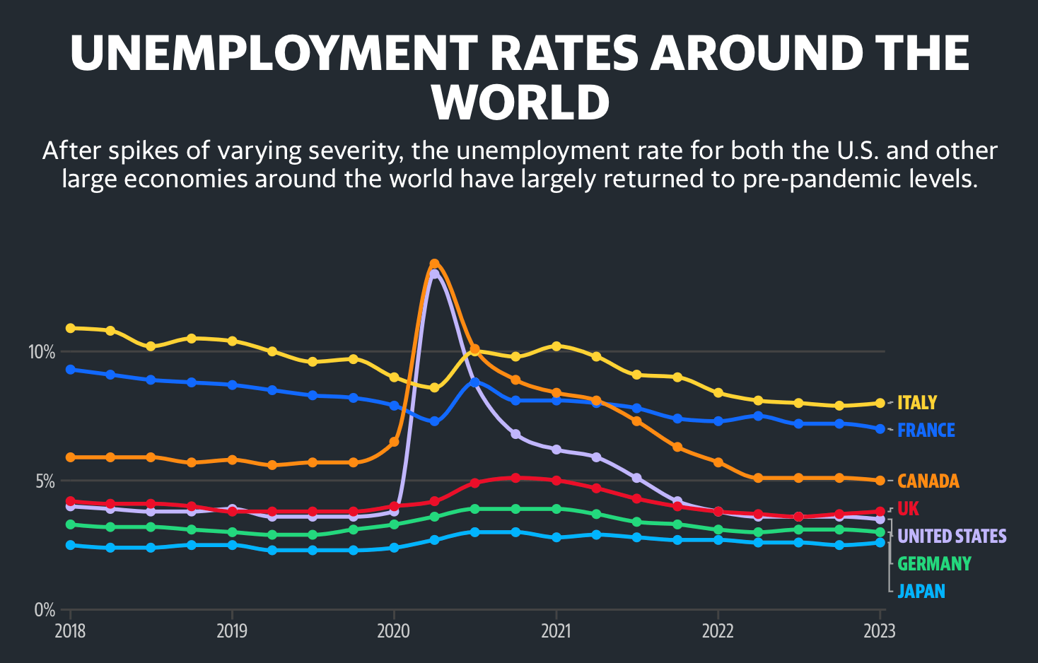 Макар че страни като Япония и Германия имат по-ниски сегашни равнища на безработица, те са имали по-ниски равнища и преди пандемията. Обратно, в страни като Италия нивото на безработица е било по-високо преди пандемията и това се резервира и през днешния ден.
