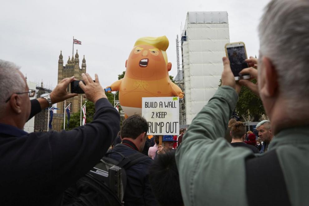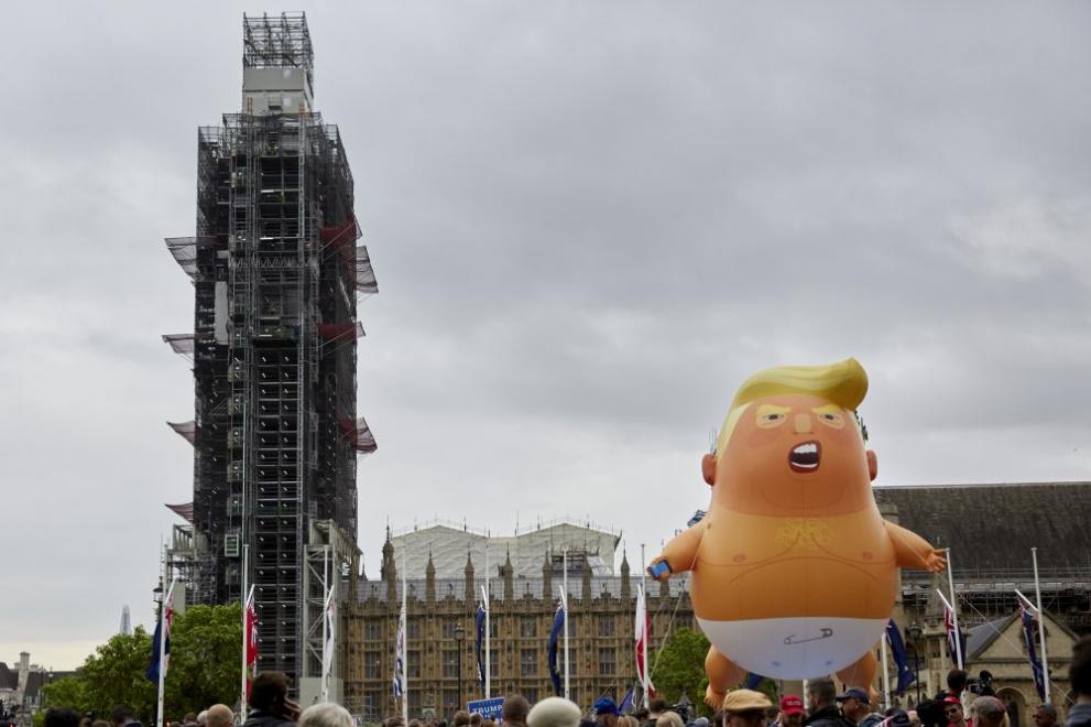 Междувременно великански оранжев балон, изобразяващ Доналд Тръмп като нацупено бебе с памперс и мобилен телефон, се издигна край английския парламент, преди един от най-големите до момента митинги против задграничен водач, съобщи Ройтерс.
