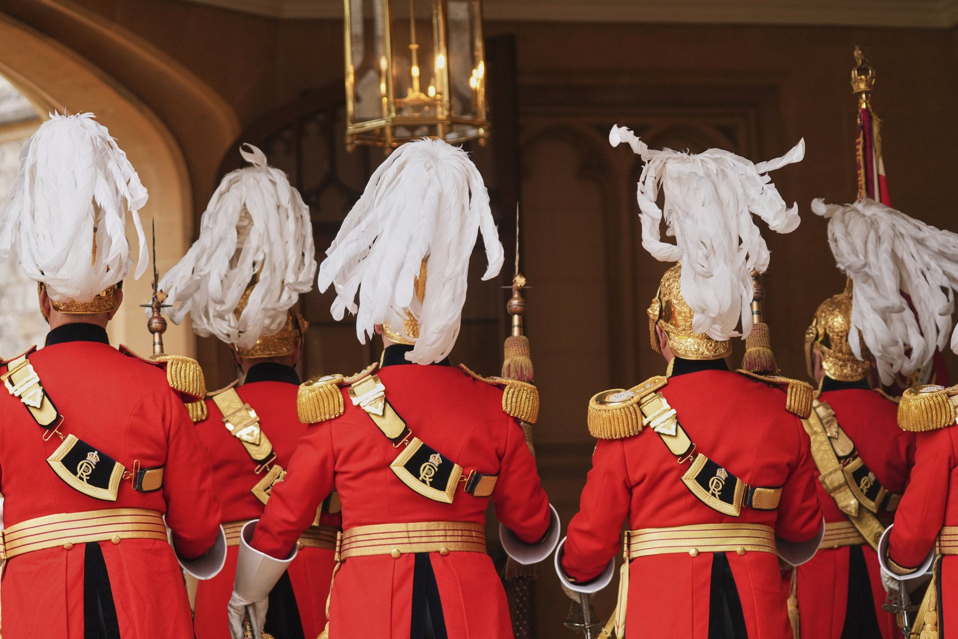 Гостите пътуваха до замъка в върволица от файтони, теглени от коне, преминавайки около редици от бойци, моряци и летци, до момента в който военни оркестри изпълняваха националните химни на Съединени американски щати и Англия.