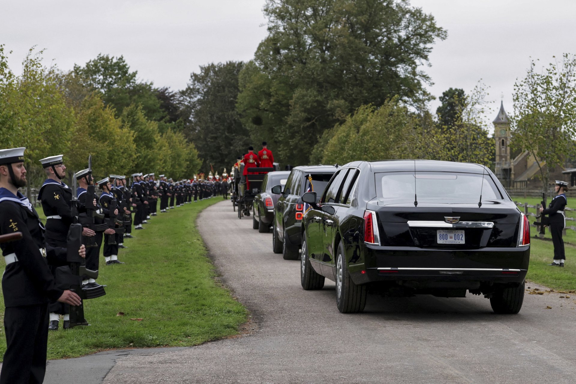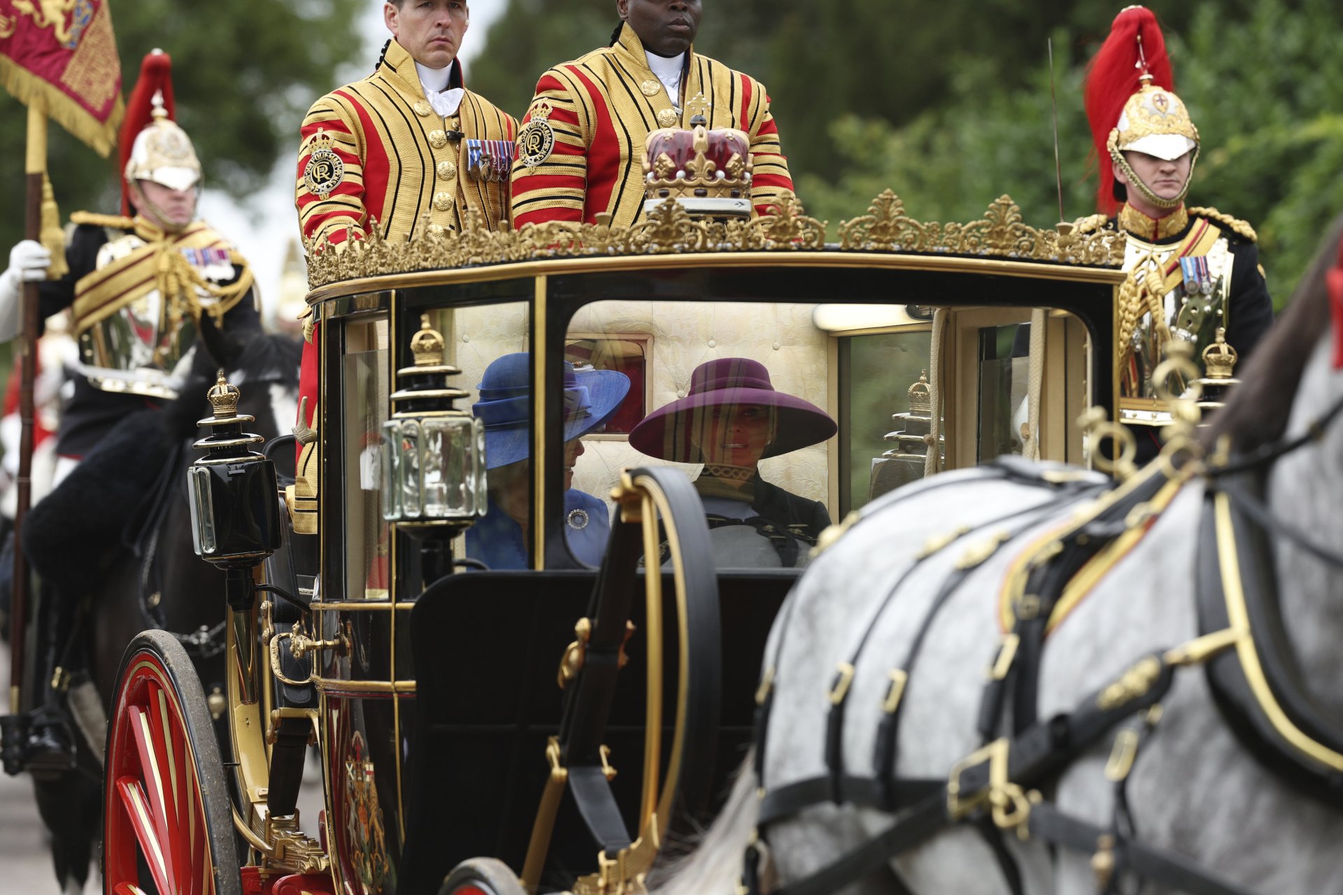 Кралят и американския президент републиканец размениха по няколко думи в Ирландската държавна карета (карета с четири коня, употребена от английското кралско семейство - бел. ред.) по време на късото пътешестване до двора на замъка, където Тръмп, съпроводен от Чарлз, инспектира почетната армия от бойци в червени униформи и шапки от меча кожа.