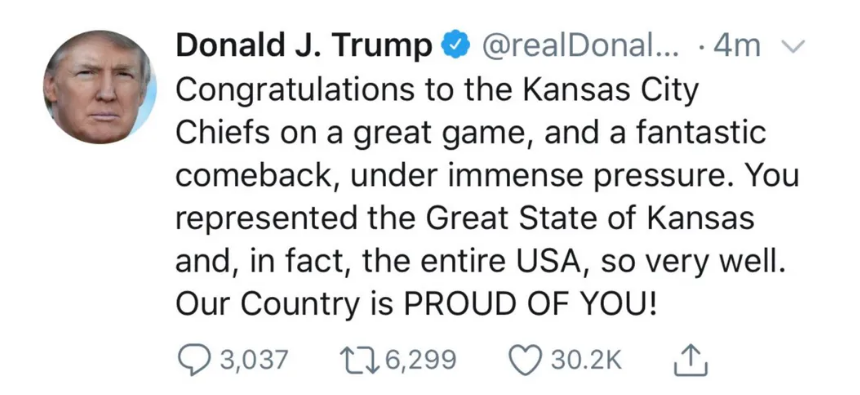 “Поздравления на Канзас Сити Чийфс за страхотния мач и фантастичния поврат под голямо напрежение. Вие представихте великия щат Канзас, както и цялостен Съединени американски щати, толкоз добре. Нашата страна се гордее с вас”, написа Тръмп в обществената мрежа.