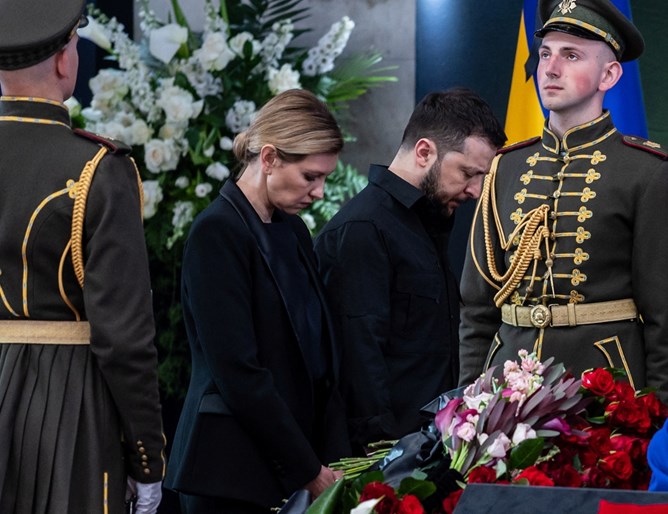 Семейство Зеленски изглеждаха спокойни, само че изтощени, до момента в който вървяха дружно, с цел да положат цветя върху ковчега на Леонид Кравчук, който стана първият, оглавил новата самостоятелна Украйна след разпадането на Съветския съюз през 1991 година, оповестяват от в. " Дейли мейл ". Той умря през уикенда, на 88 години, след „ дълготрайно боледуване”.