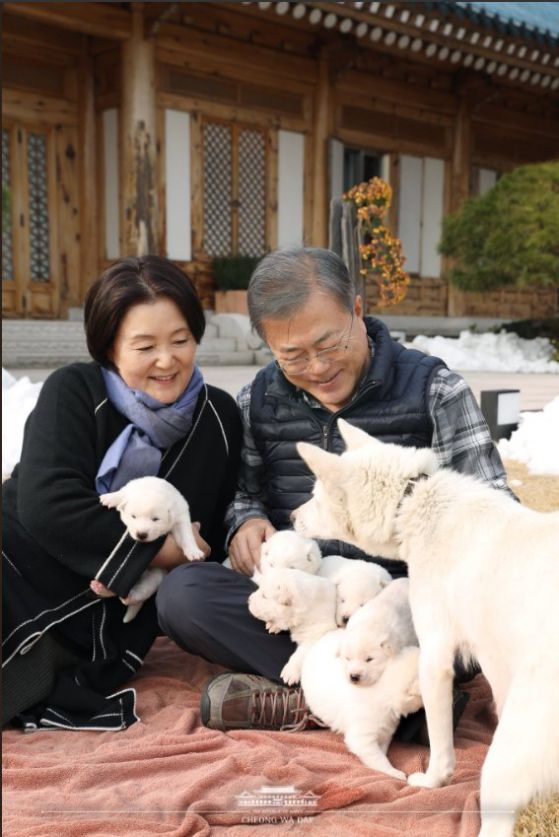 Снимките, публикувани в неделя, демонстрират Мун и неговата половинка пред резиденцията в Сеул усмихнати, заобиколени от 6 дребни кученца и тяхната майка Гоми.