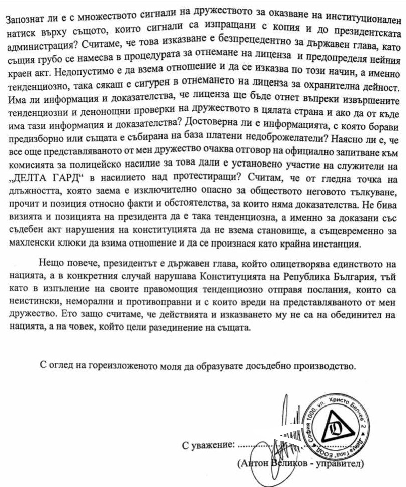 " Недопустимо е настоящ президент, който следва да е обединител на нацията, да настройва предизборно обществото по този метод, изразявайки отношение, което почива на клюки. Откъде същият е получил информация, че сдружение с 15 години история и стотици чиновници, водещо в охранителния отрасъл, е " частна милиция " и нейните чиновници са " дерибеи " и " дерибействат? ", питат в сигнала си от " Делта гард ".