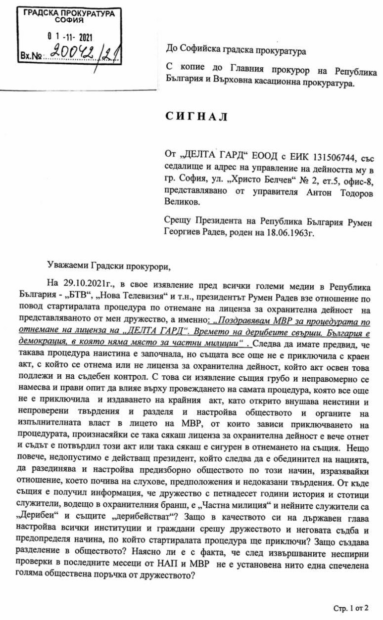 Президентът Радев е даден на прокурор от шефа на известната охранителна компания " Делта гард " Антон Великов. Повод са думи на президента, ориентирани против компанията, чийто лиценз Министерство на вътрешните работи на Бойко Рашков желае да отнеме.