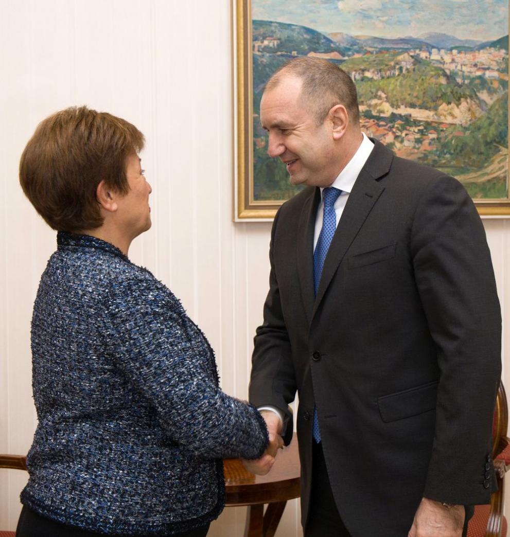 Президентът Румен Радев се срещна през днешния ден на " Дондуков " 2 с ръководещия шеф и ръководител на Изпълнителния съвет на МВФ Кристалина Георгиева. Това оповестиха от прессекретариата на президента.