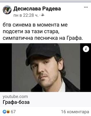 Към поста си Радева е добавила песента на Владимир Ампов-Графа от 2008 година " Боза ".