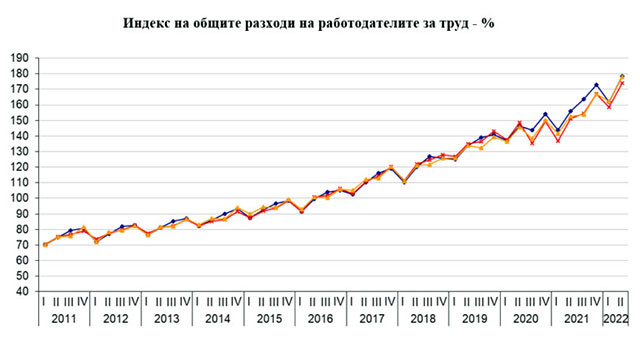С 14.4% нарастват общите разноски на работодателите за един отработен час от наетите от тях лица през второто тримесечие на 2022 година по отношение на второто тримесечие на 2021 година по предварителни данни, оповестиха от Националния статистически институт (НСИ). В промишлеността нарастването е с 15.0%, в услугите - с 16.8%, и в строителството - с 11.5%.