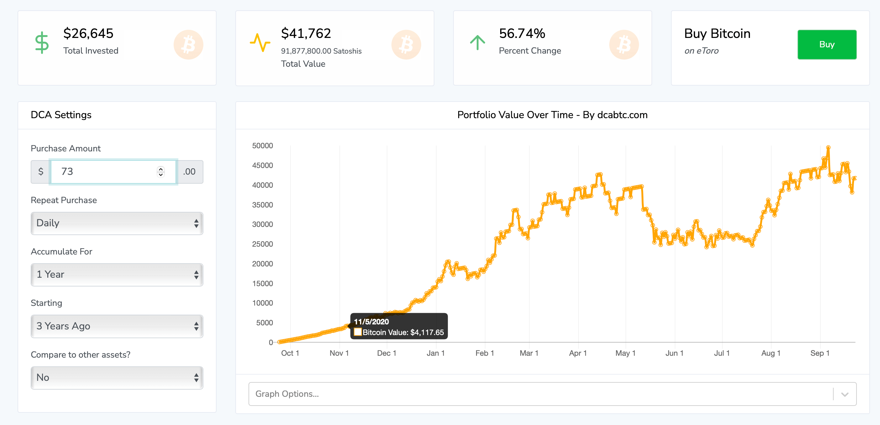 Според данни отплатформата Dollar Cost Averaging Bitcoin, в случай че човек беше почнал да влага по $73 на ден в Биткойн тъкмо преди една година, на 24 септември 2022 година, в този момент щеше да има един цялостен Биткойн токен, въз основа на настоящата цена на Биткойн. която е към $26,500.