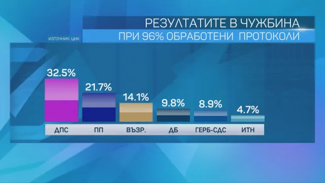 При съвсем 95% обработени протоколи от гласуването на предварителните парламентарни избори зад граница максимален % получава – 32,5%.