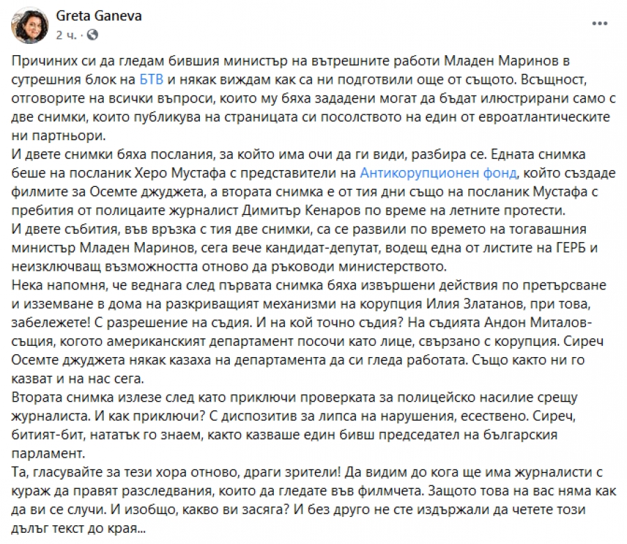 " Причиних си да виждам някогашния министър на вътрешните работи Младен Маринов в утринния блок на БТВ и някак виждам по какъв начин са ни подготвили още от същото. Всъщност, отговорите на всички въпроси, които му бяха заложени могат да бъдат илюстрирани единствено с две фотоси, които разгласява на страницата си посолството на един от евроатлантическите ни сътрудници.