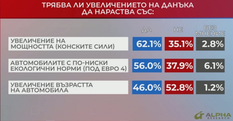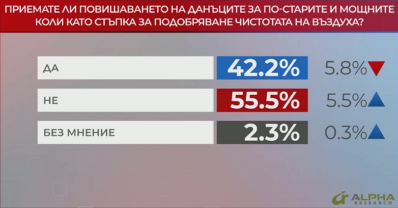 " Приемате ли повишението на налозите за по-стари и по-мощни коли като стъпка за възстановяване качеството на въздуха? " - това беше допитването, извършено от " Алфа Рисъчрч " по тематиката на предаването " Референдум " довечера. 42,2% от интервюираните считат мярката за позитивна, съгласно 55,5% повдигането на данъците няма да се отрази на чистотата на въздуха, а 2,3% нямат мнение.