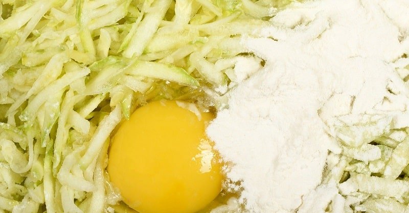 В комфортен съд разбийте яйцата със сол и черен пипер. Добавете настърганите тиквички и разбъркайте добре.