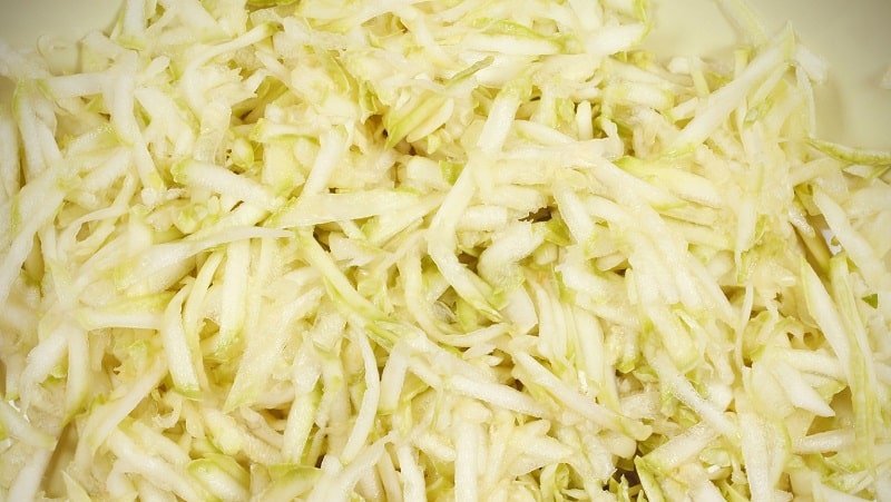 Измийте тиквичките, обелете и настържете на едро ренде.