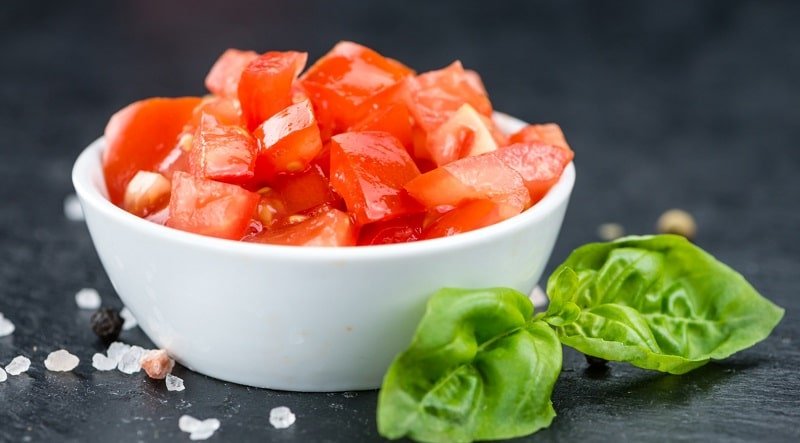 Измийте и нарежете на ситно доматите.