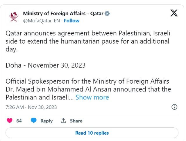 „ Палестинската и израелската страна реализираха съглашение за удължение на филантропичното помирение в Ивицата Газа с спомагателен ден при същите предходни условия. Те са преустановяване на огъня и нахлуване на филантропична помощ, в границите на взаимното ходатайство на Катар “. Това се сподели в изказване представителят на Министерство на външните работи Маджед Ал Ансари.