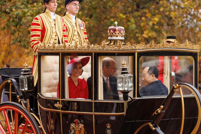 Принц Уилям и принцеса Кейт се срещнаха с президентската двойка в хотела им в Лондон. След това пътуваха дружно до парада на конната армия, където се причислиха към крал Чарлз и кралица Камила за церемониалното посрещане, което включваше два церемониални оръжейни салюта (в Грийн Парк и Лондонската кула) от 41 изстрела, звучащи из целия град.