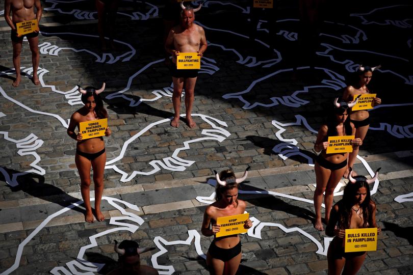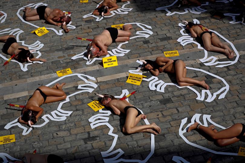 Природозащитници организираха протестна акция в испанския град Памплона, като се съблякоха поти голи и изобразяваха убити бикове. Само по слипове 54 души с рога на главите легнаха на площада пред постройката на градския съвет.