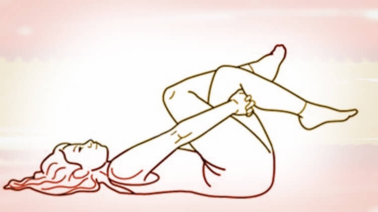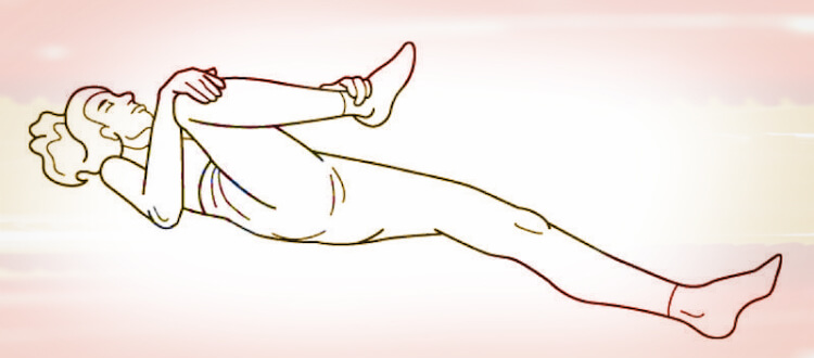 Отново легнете на гърба си , огънете двата крайници в коленете, леко ги издърпайте към гърдите, без да повдигате таза от повърхността.