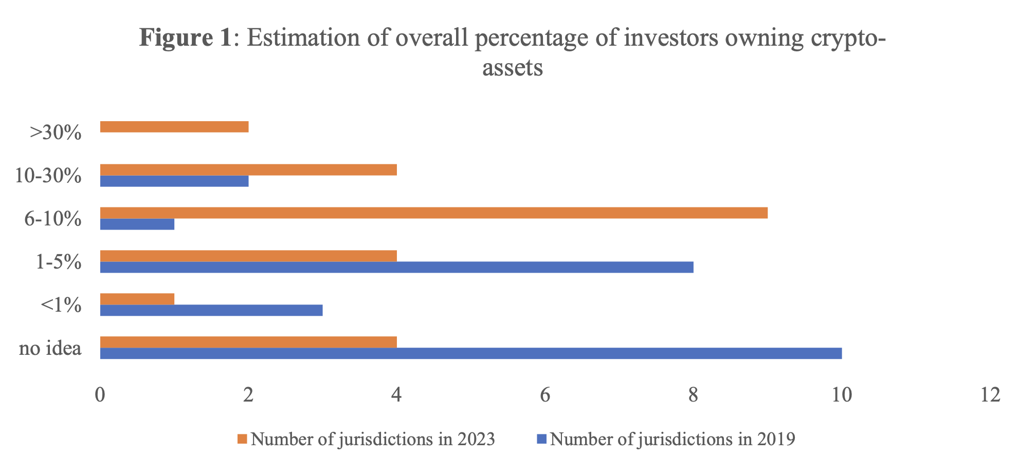 В шест юрисдикции процентът на благосъстоятелност е достигнал 30% или повече. Това бележи внезапно нарастване спрямо 2020 година, когато към половината от далите отговор райони са оценили, че единствено от 1% до 5% от вложителите са имали крипто активи.
