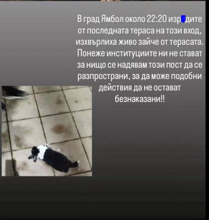 Притеснителен сигнал популяризират жители. Хора настояват, че живо зайче е било хвърлено на улицата от висок етаж на блок. Случаят е от неделя вечер. За обстановката от Ямбол алармира Елена Димитрова във Фейсбук, която споделя, че попаднала на обява по тематиката в друга обществена мрежи. Публикавана е и фотография на лежащото на асфалта животно. Към момента няма повече информация по случая. Заглавната фотография е илюстративна   Снимката, публикувана от Елена Димитрова във Facebook  --> Напишете коментарИме:* -->  captcha Текст:* -->