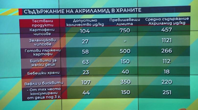 От тази година БАБХ изследва храните за акриламид, съобщи инж. Нели Тодорова от БАБХ. Прилагат се ограничения за определяне на тези равнища, в случай че има такива. Стана ясно,че в България има лаборатория, която изследва съществуването на акриламид, само че тя е частна.